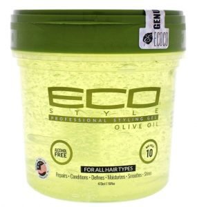 The Eco-style Gel is made with 100% pure Olive oil. Water (Aqua), Hydrogen, Amino-2, Wheat protein, and fragrance. Use this Gel on dry or wet hair. It is suitable for all types of curly hair.