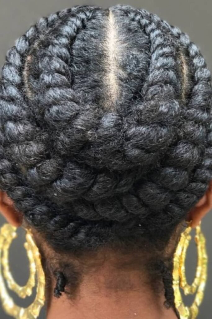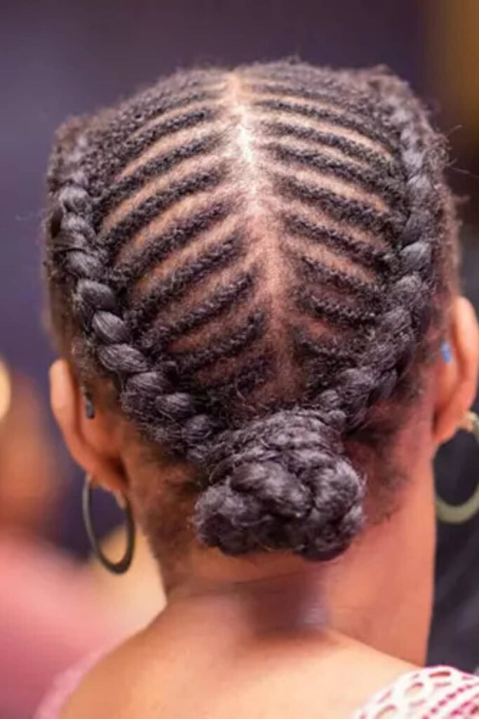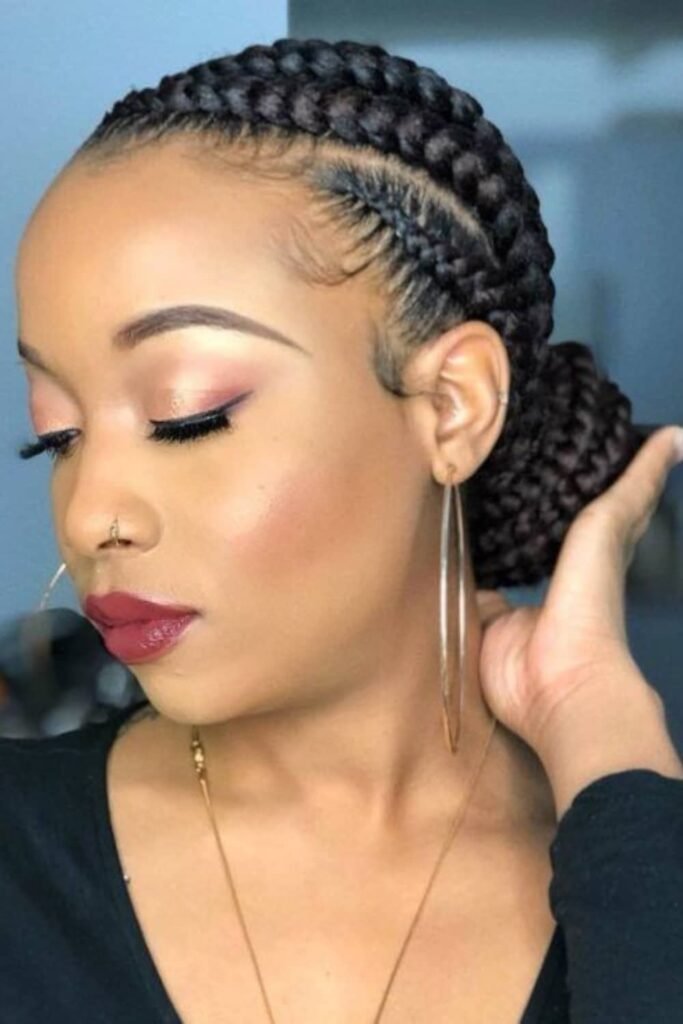 A sleek low bun paired with side cornrow designs is effortlessly chic. It creates a structured yet soft look that works beautifully for fancy dinner dates or formal events.