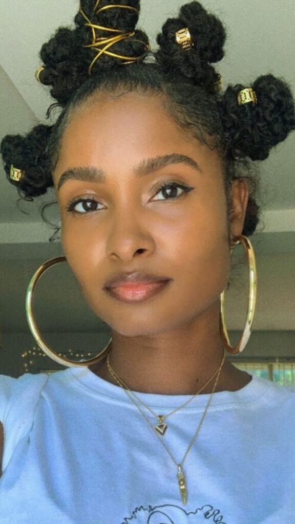 Nothing says “festival-ready” like a big, voluminous afro puff decorated with metallic cuffs or clips. Afro puffs are easy to achieve and low-maintenance, making them perfect for outdoor events.