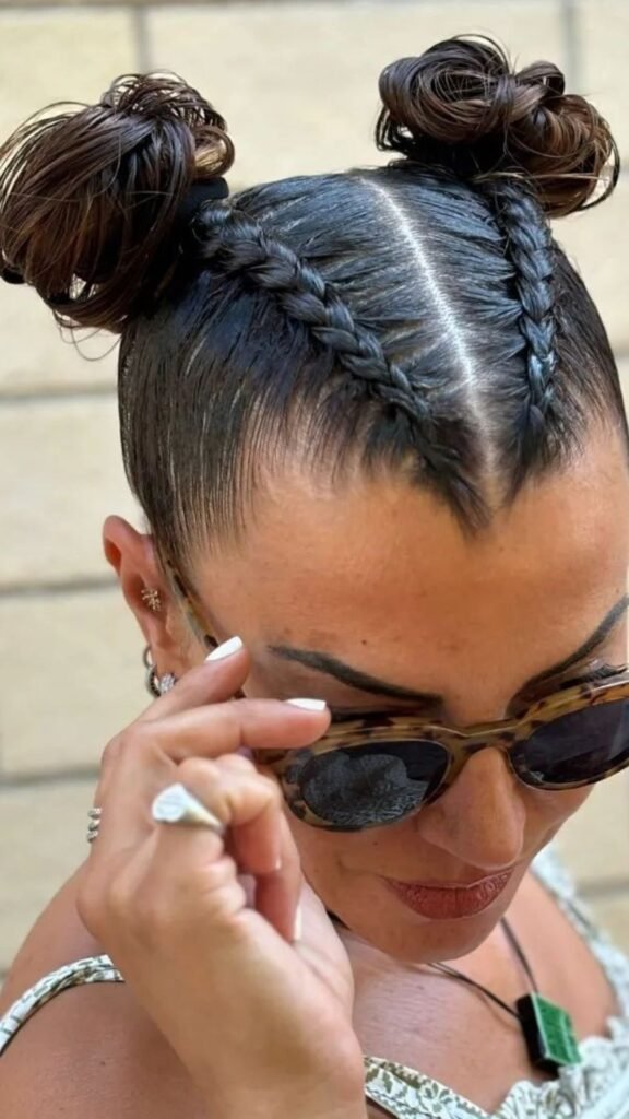 If you’re aiming for a futuristic festival look, try sleek space buns with glitter roots. This style works beautifully for natural hair and is perfect for short to medium lengths.