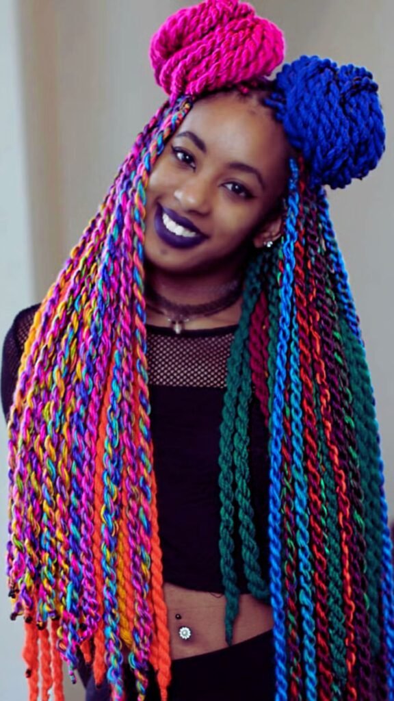 Give your two-strand twists a fun update by weaving in colorful threads or yarn. This 2025 festival hair trend brings life to your look while keeping your natural hair safe and stylish.