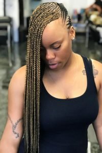 Lemonade braids are regularly styled aside. However, how far over they are twisted is up to you. Here the hair is braided altogether to something contrary to the head with a dazzling geometric designed part.