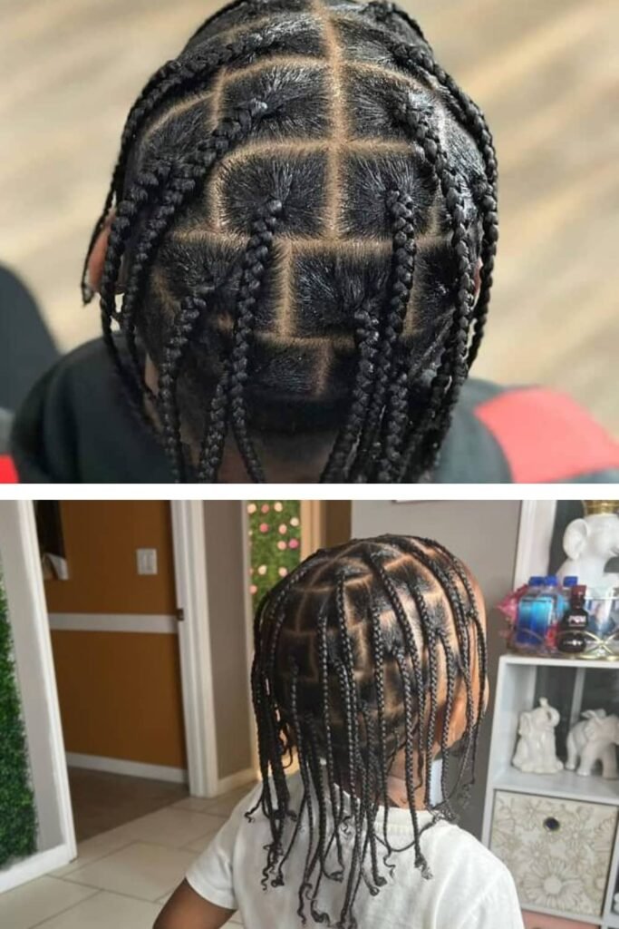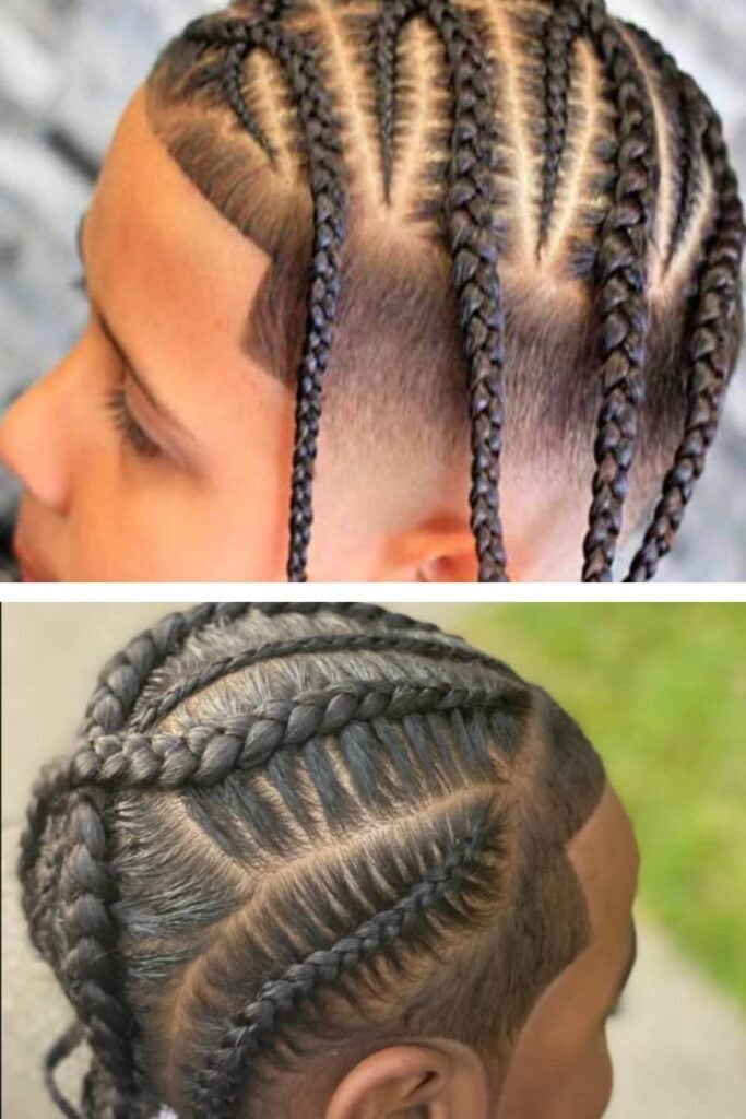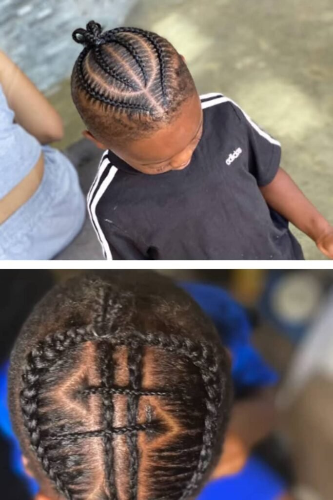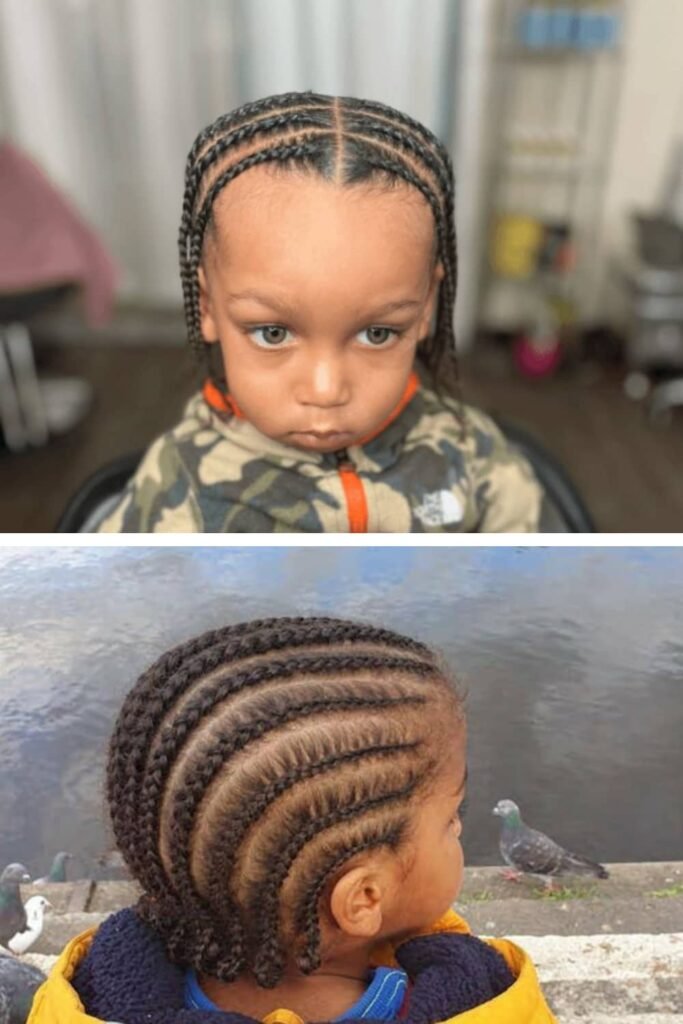 This is the most traditional and timeless cornrow style for little boys. Clean, straight lines going from the front to the back of the head create a neat and classic look. This style is perfect for school or everyday wear and is easy to maintain for both kids and parents.