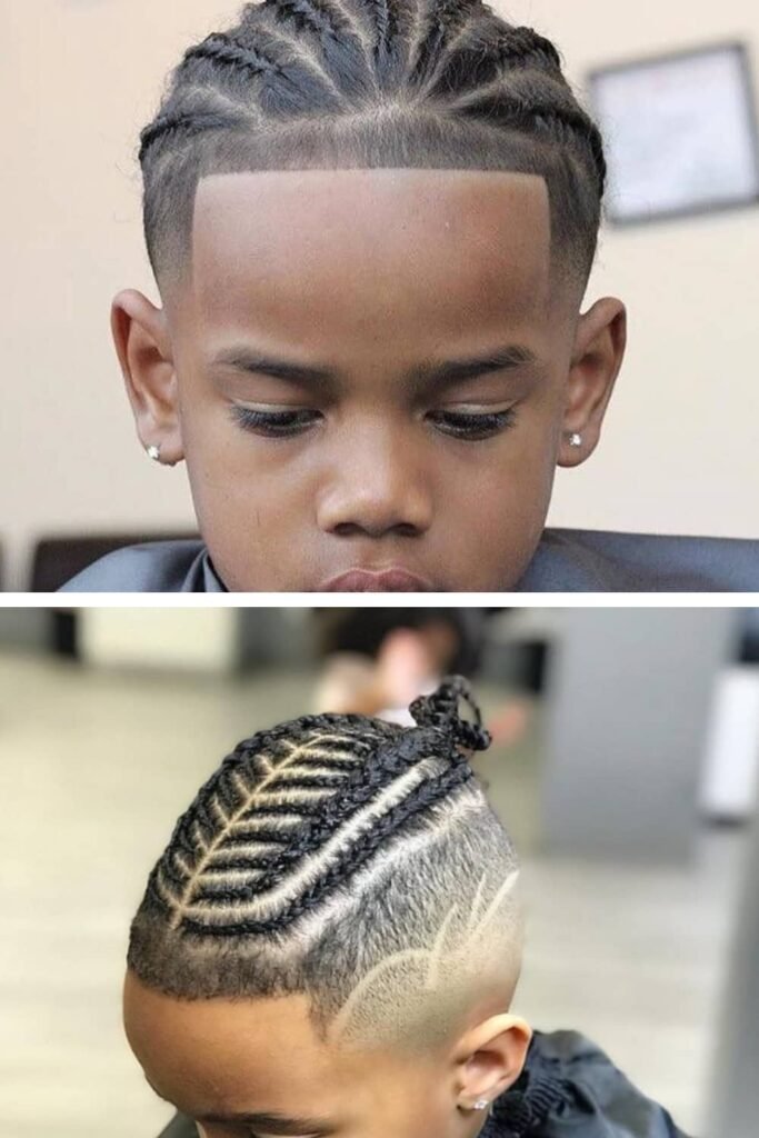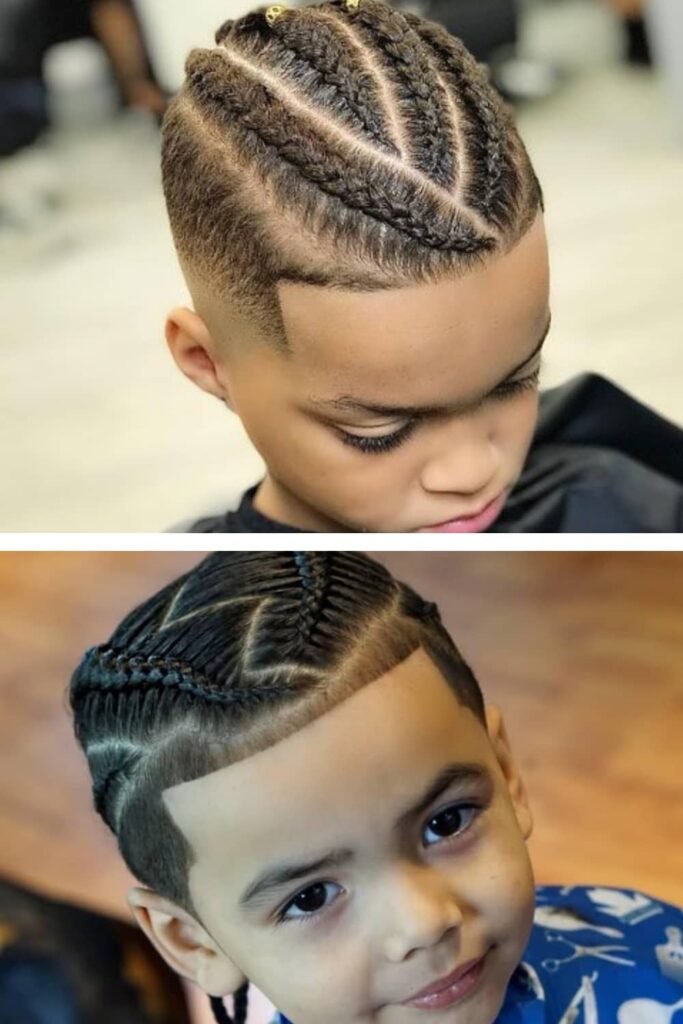 For a more modern and stylish twist, pair cornrows with a fade on the sides. This look blends the neatness of braids with the edginess of a barbershop-style fade, giving your little boy a trendy look that older kids and adults love, too.