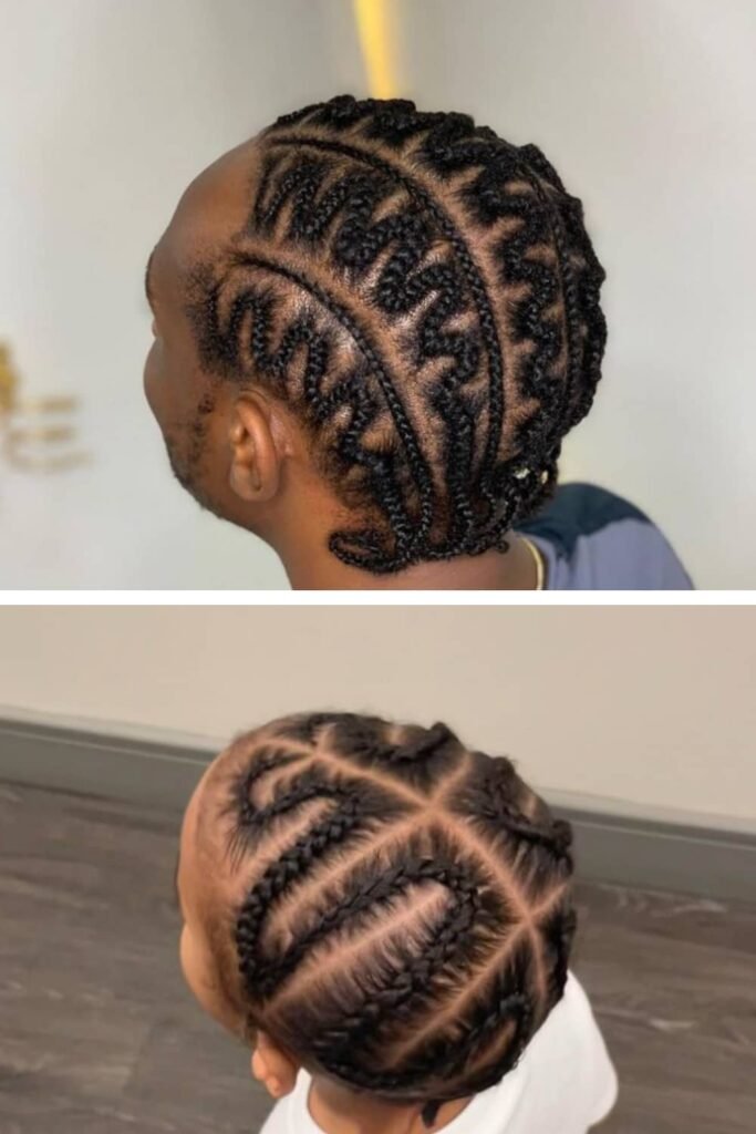 Want something a little more fun? Zig-zag cornrows add personality and a touch of flair. The braids follow a zig-zag pattern across the scalp, creating a unique design that’s sure to stand out on the playground or at family events.