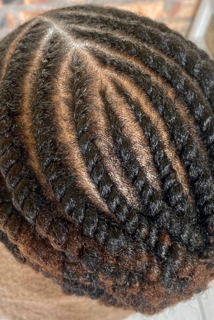 Flat twists styled with a middle part create a sleek and protective hairstyle. The twists start from the center part and flow toward the sides or the back.