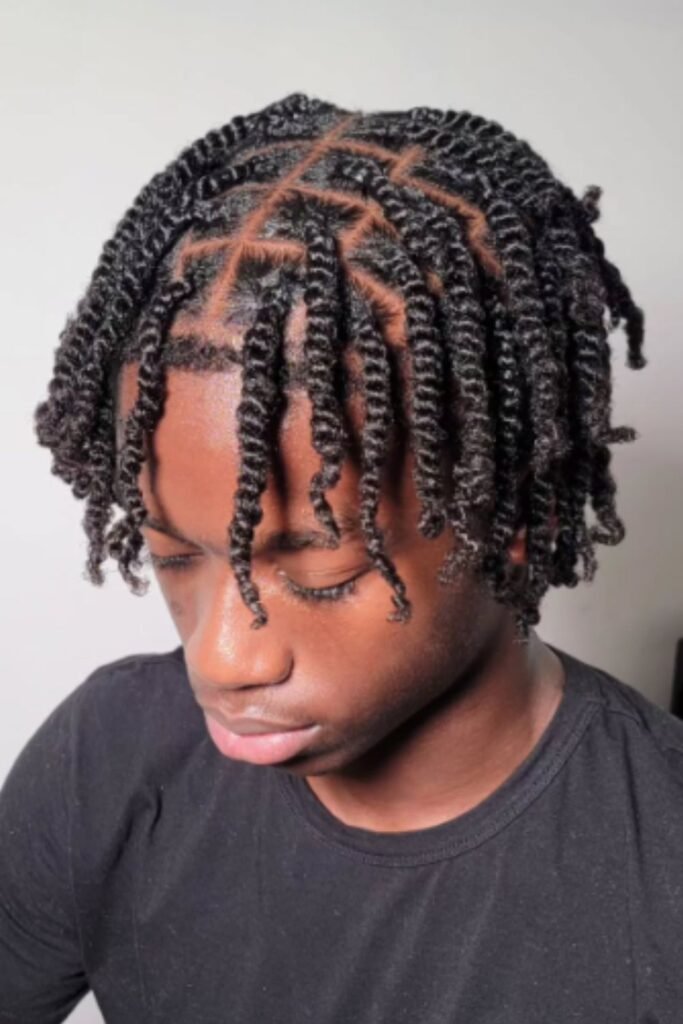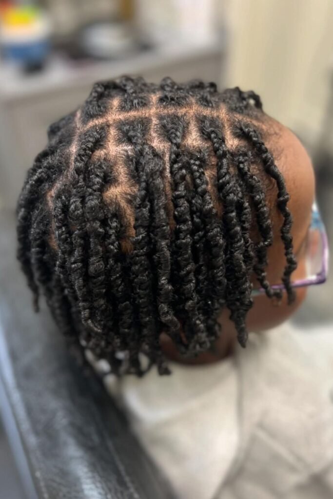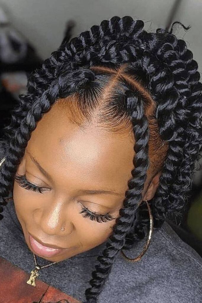 Two-strand twists styled with a middle part create a very neat and versatile hairstyle. The twists fall naturally on both sides of the face, giving a soft and flattering frame.