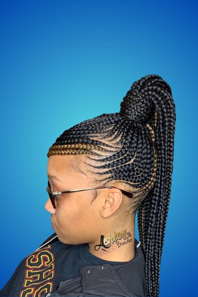 A braided ponytail combines neat scalp braids with a sleek ponytail finish.