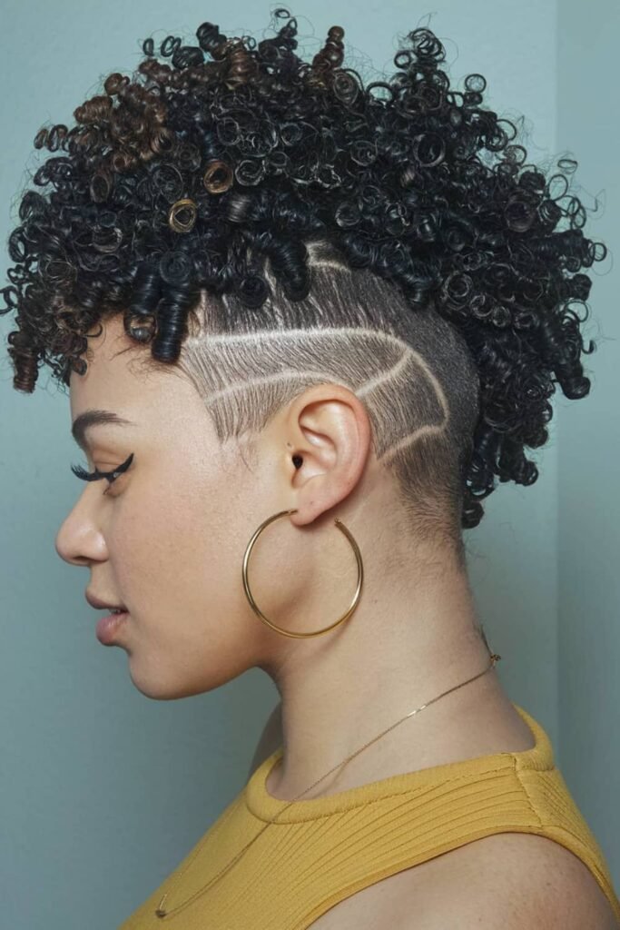 Another mohawk-inspired style, this curly mohawk with a shaved side is ideal for women who love to embrace their natural curls in a dramatic and daring way. The shaved side provides contrast to the wild, voluminous curls on top, making the hairstyle look even more bold and fun. You can style the curls in tight ringlets or loose waves, depending on your desired look.