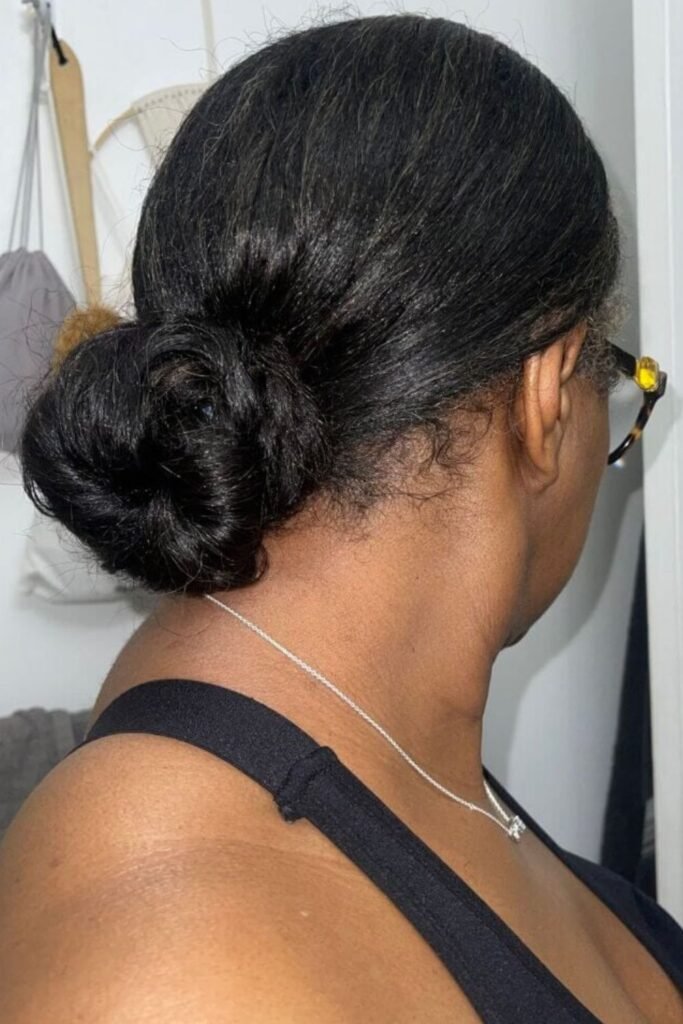 - Middle-part low puff for a polished look